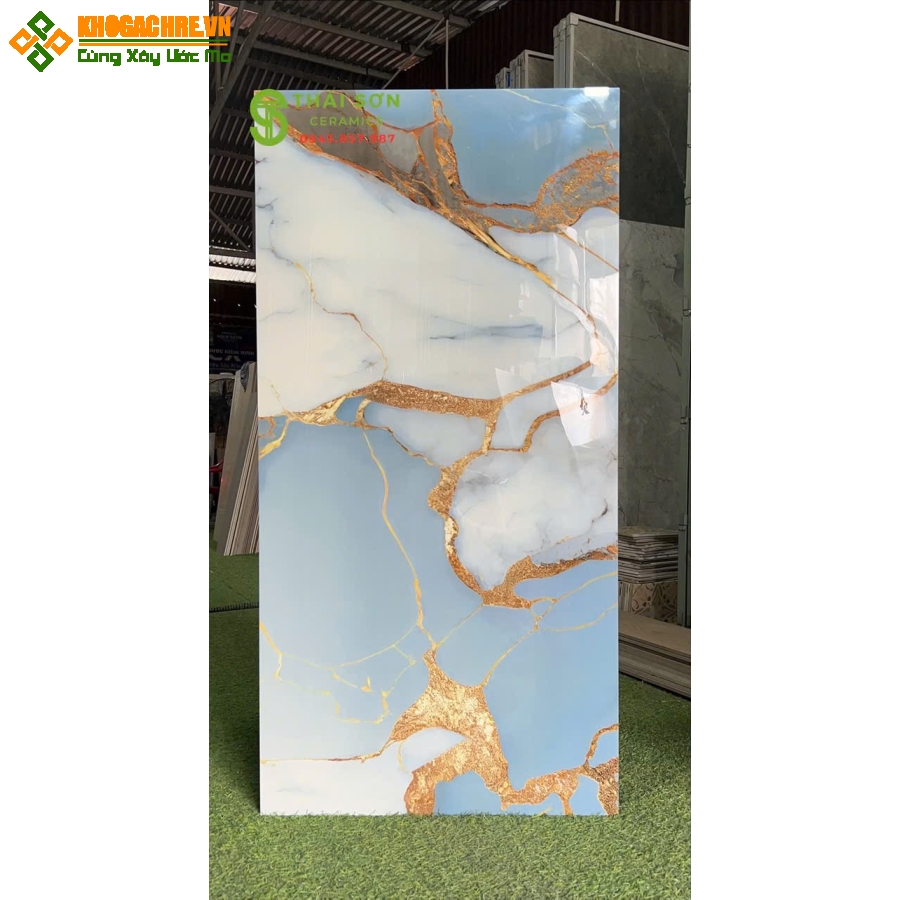 Gạch lát nền 60x120 siêu bóng màu xanh trắng chỉ vàng | Gạch Ấn Độ 60x120 lát nền màu xanh vân trắng với những đường chỉ vàng lấp lánh tạo nên sự sang trọng thích hợp cho lát nền nhà phòng khách, là dòng gạch ngang 60cm và cao là 120cm với kiểu vân tự nhiên không lặp lại ,trên mỗi viên gạch đều có kiểu vân khác nhau .Gạch 60x120 Ấn Độ là dòng gạch ốp lát khổ lớn, có kích thước 60x120 cm, được sản xuất tại Ấn Độ theo công nghệ hiện đại và tiêu chuẩn châu Âu. Dòng gạch này nổi bật với độ bền cao, khả năng chống thấm, chống trơn trượt, chống bám bẩn, cùng với vẻ đẹp sang trọng, tinh tế từ mẫu mã đa dạng, màu sắc hài hòa và hoa văn sắc nét.
